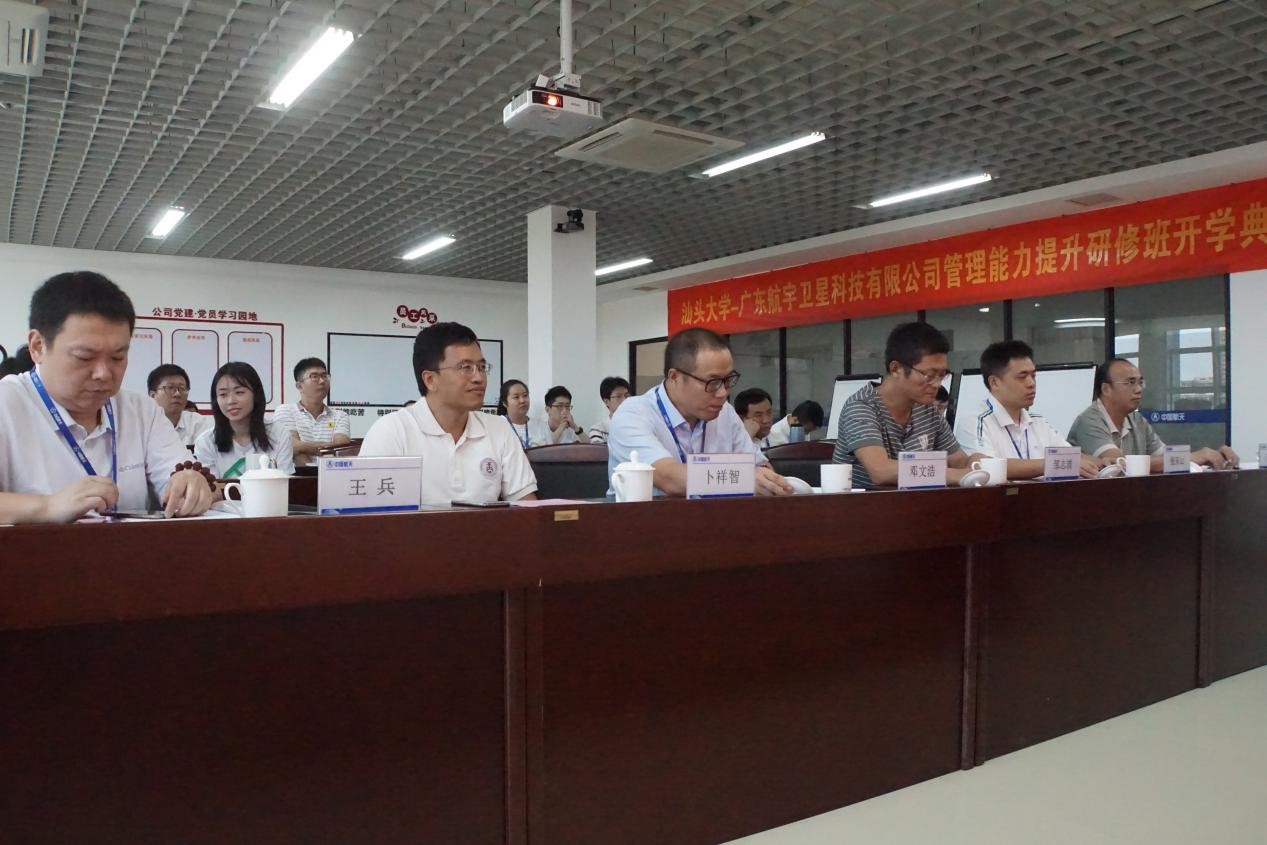 2019年9月22日上午九点,由汕头大学商学院承办的“汕头大学—广东航宇卫星科技有限公司管理能力提升研修班”在航宇卫星大厦顺利开班。汕头大学商学院党总支书记兼副院长邹志波、副院长卜祥智、广东航宇卫星科技有限公司总经理邓文浩、副总经理张东山、副总经理王兵、党总支副书记王君程出席本次开学典礼。