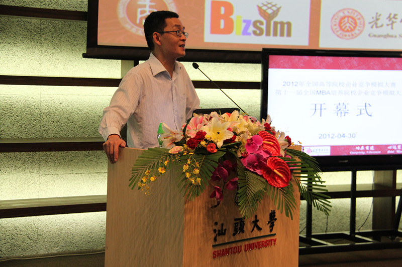 2012年4月30日,由全国工商管理硕士(MBA)教育指导委员会、全国高校教育技术协作工作委员会、中国管理现代化研究会决策模拟专业委员会主办,汕头大学商学院、汕头大学MBA教育中心、北京大学光华管理学院、北京大学经济管理实验教学中心、北京大学创新研究所承办的2012年全国高等院校/全国MBA培养院校企业竞争模拟大赛决赛在汕头大学举行。北京大学光华管理学院王其文教授、王明健教授、张洁老师、汕头大学林丹明教授、王祎教授、曾凡奇副教授等出席开幕式,开幕式由汕头大学商学院副院长王祎教授主持,汕头大学副校长林丹明教授致辞。