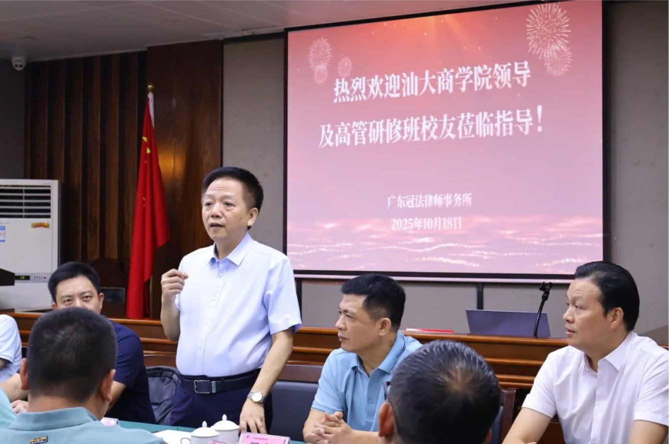 活动首站,汕大揭阳校友会名誉会长、事务所主任林杰坤带领大家参观事务所,通过宣传片全面介绍律所发展历程与管理制度。值得关注的是,该律所的五位核心成员均毕业于汕大,这份共同的校友情谊让彼此的交流更显亲切。结合三十余年执业经验,林杰坤主任围绕AI冲击、社保合规、劳动用工、合伙制度等企业管理痛点,为研修班企业家校友提供了专业解答。这一“法商融合”的深度分享,让在场校友感受到跨学科知识体系对企业合规经营的实践价值,引发强烈共鸣。