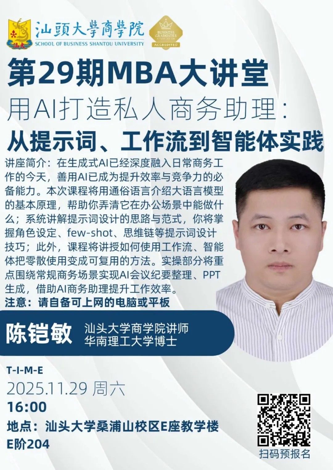 本期MBA大讲堂特邀汕头大学商学院陈铠敏博士主讲。陈博士长期深耕数智化运营、数据科学与机器学习应用等领域,理论功底扎实且实践经验丰富。凭借深厚的专业积累,陈博士还荣获国家A类学科竞赛最佳指导教师、优秀指导教师等荣誉,擅长将前沿学术成果转化为通俗易懂的实操方法。