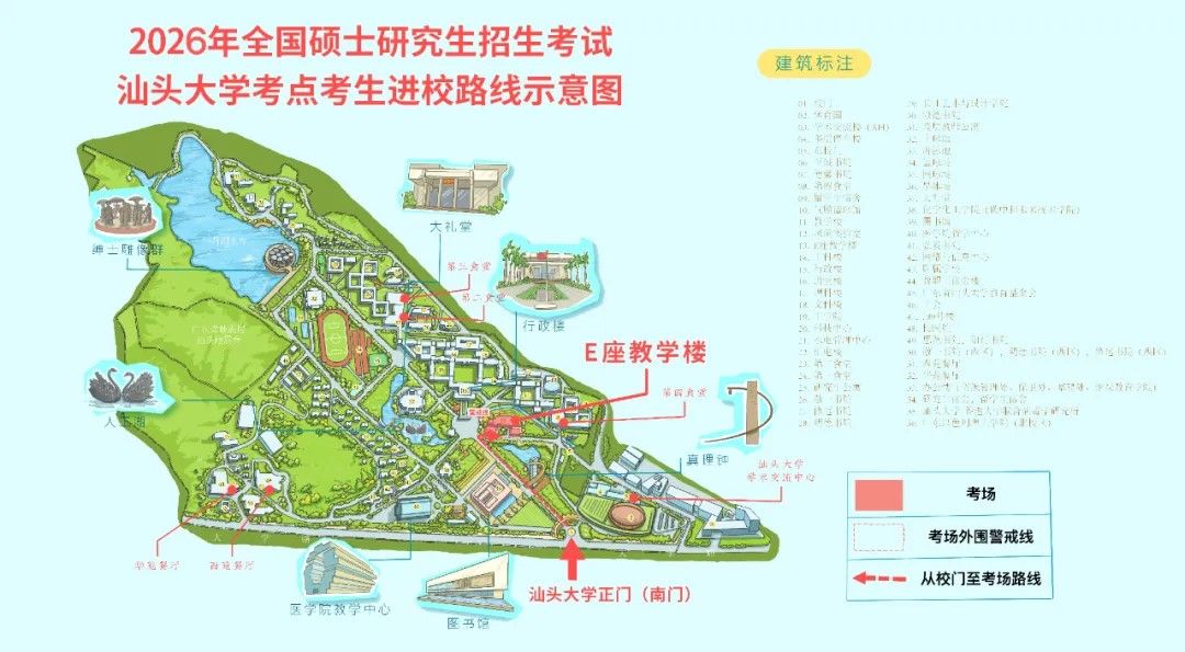 1.提前规划路线。考试期间,我校桑浦山校区实行交通管制,校外车辆不允许进入,考生须步行进入校园。请考生根据《准考证》上的考试地点,提前规划好出行时间和路线,建议乘坐公共交通工具出行。考生可以从正门(南门)进出校园。地图指引详见《2026年全国硕士研究生招生考试汕头大学考点考生进校路线示意图》(附件1)。