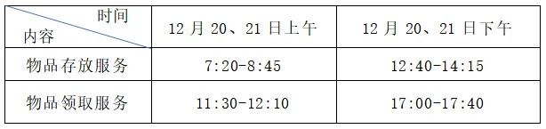 特别提醒:虽然我考点为考生提供免费物品寄存服务,但由于考生较多,物品存取均需要一定时间,建议考生尽量不携带上述与考试无关的物品到达考点,确有物品寄存需要的,请考生至少提前1小时到达“考生资料存放区”,进行手机和物品存放,存放好手机等物品后,按要求经过智能安检门的检测。由于寄存物品原因等造成考生无法进入考场的,考点不承担相关责任。