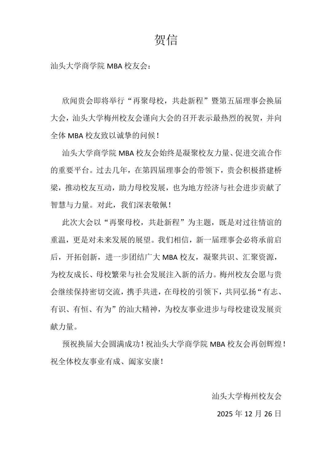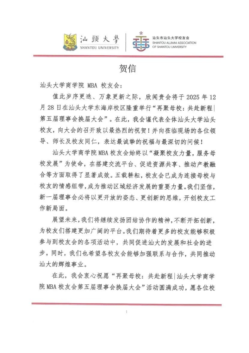 兄弟校友会纷纷发来贺信,致以诚挚祝愿,愿与汕大MBA校友会携手共进,共同弘扬“有志、有识、有恒、有为”的汕大精神。