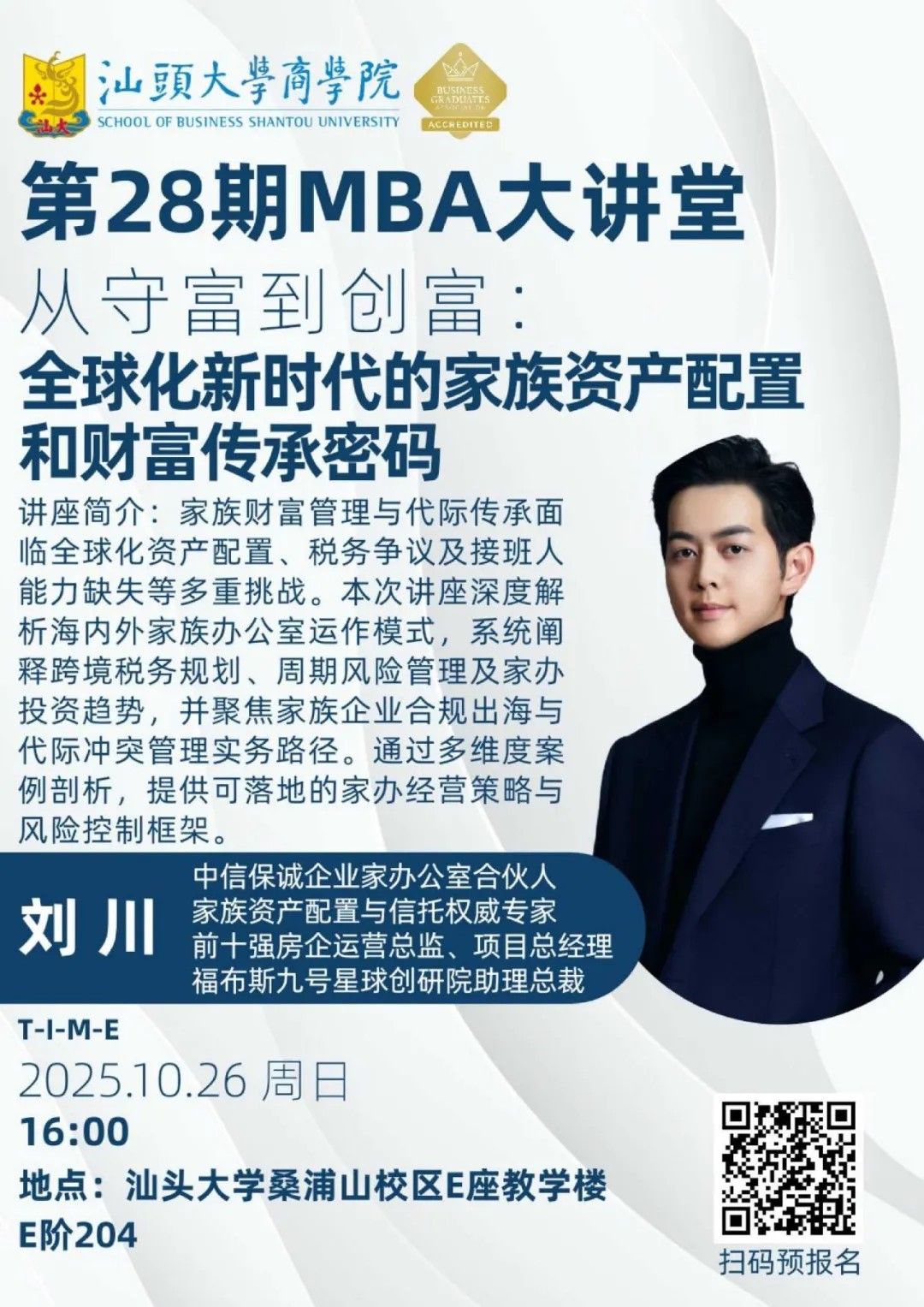 本期讲座特邀中信保诚企业家办公室合伙人、汕头大学商学院优秀校友刘川先生主讲,依托跨国公司运营及家族信托架构实战经验,系统解析家族办公室运作核心模块:跨境税务协调框架、家企合规出海路径设计、代际传承冲突解决方案,以及周期适应性资产配置策略,通过多维案例提供可落地的实施框架,助力了解高净值家族构建全球化时代的财富管理护城河与代际传承路径的密码。