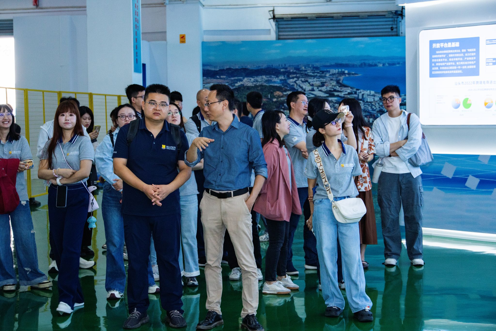 在汕头保税区物流中心有限公司陈鹏总经理及团队的引导下,师生首站探访综保区业务展示中心。围绕“开放平台”“开放产业”“开放合作”“开放环境”四大核心板块,大家系统梳理园区发展脉络与特色优势,重点研习其通过构建“买卖全球”跨境电商平台、培育“出口集聚”产业集群、深化“双向循环”区域合作、打造“便利高效”营商环境四大举措助推高质量发展的实践路径,深切体悟汕头“因开放而生、因开放而兴”的独特城市基因。