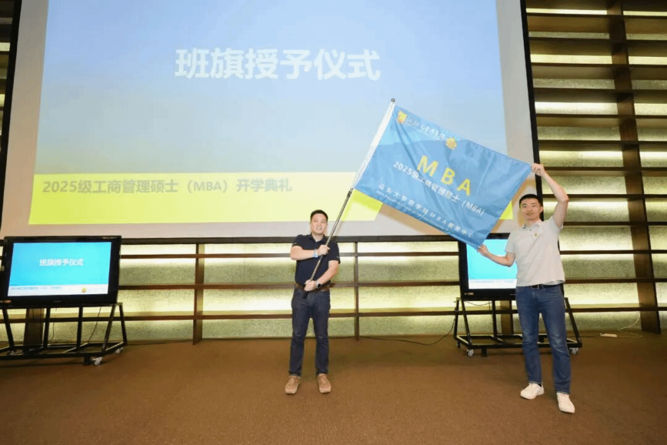 汕头大学研究生院副院长李润钿为2025级MBA新生代表许南臻、陈一林佩戴校徽,现场氛围庄重而温馨。校徽不仅象征着新身份,更寄托着责任与使命。随后,2025级MBA班主任陈创斌老师从梁强院长手中郑重接过班旗,高高举起的班旗寓示着2025级MBA“商学航程”正式启程,驶向新的征程。