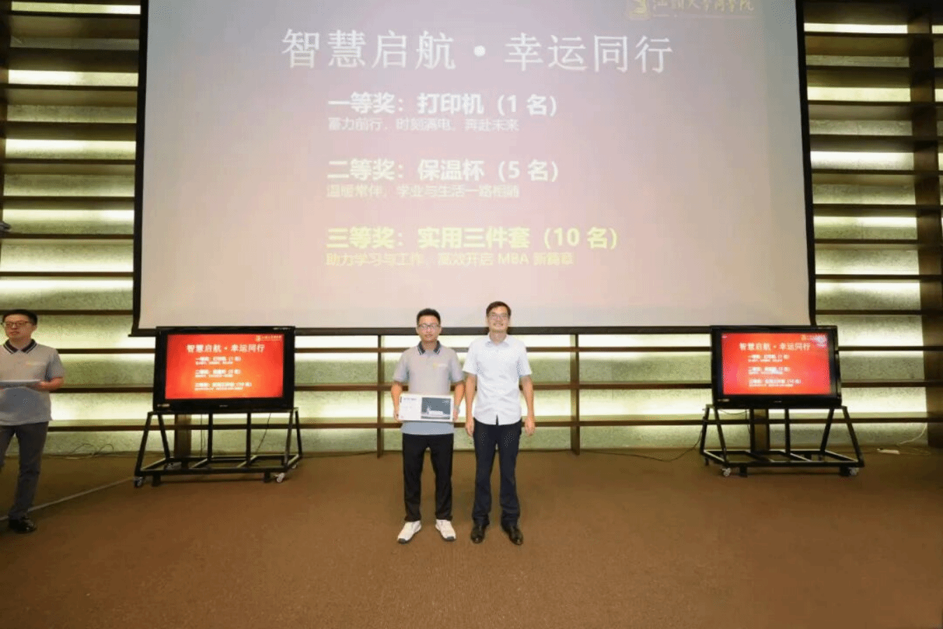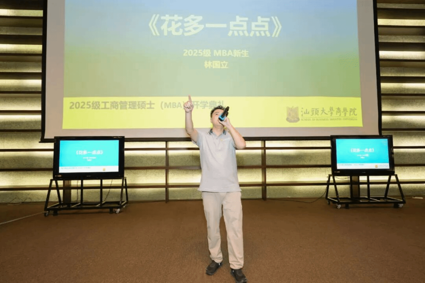 本次开学典礼特别设置了抽奖环节,以传递对新生的美好祝福。奖品涵盖学习必备的“实用三件套”、精美保温杯以及多功能打印机等“学业神器”,为新生带来满满惊喜。才艺表演环节中,2025级MBA新生林国立以潮语、粤语和普通话三语说唱演绎《花多一点点》,精彩表现赢得阵阵掌声,充分展现了新生的青春活力与多元风采。