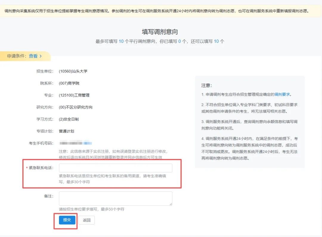 1.调剂意向采集系统仅用于招生单位提前掌握考生调剂意愿情况。调剂服务系统开通24小时内,在满足条件的前提下,考生可将调剂意向转为调剂服务系统中的调剂志愿,成功后不可取消或更改。调剂服务系统开通24小时后,考生无法再将调剂意向转为调剂志愿。