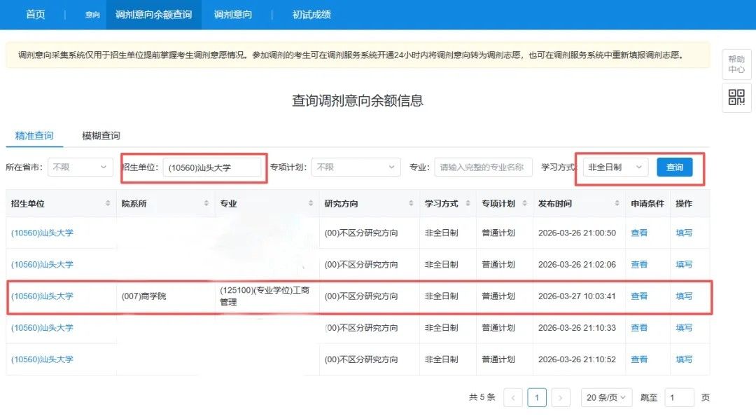 自3月27日起,考生可登录调剂意向采集系统,按“招生单位(10560:汕头大学)”“所在省市”和“专项计划”等条件查询调剂意向余额信息。
